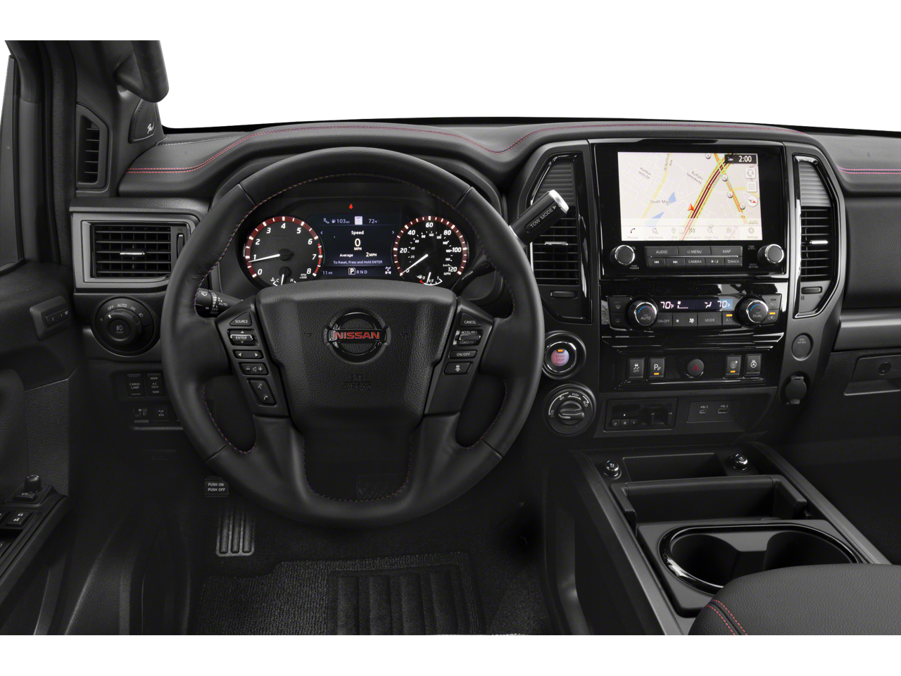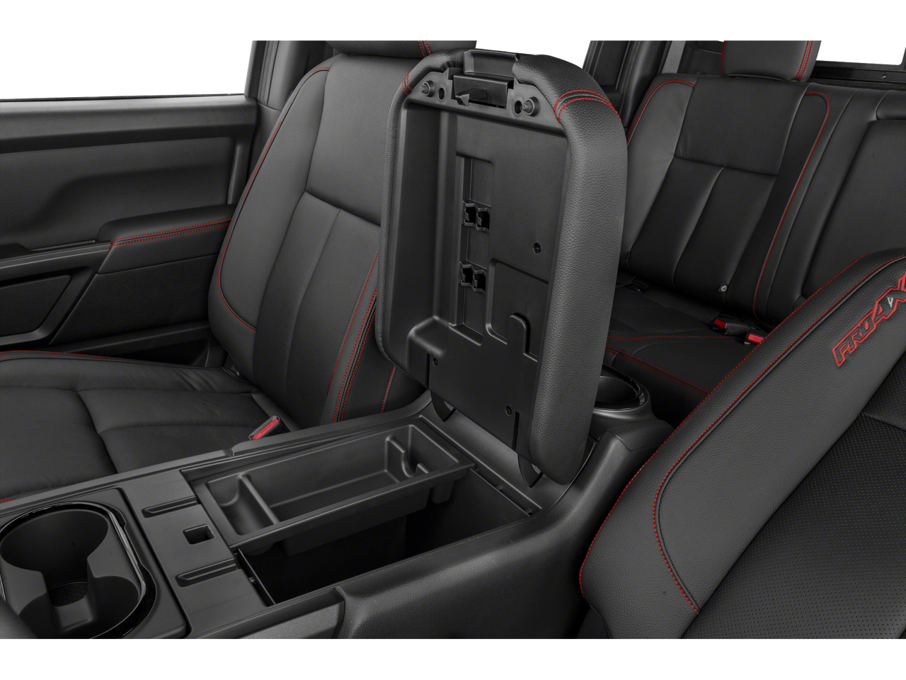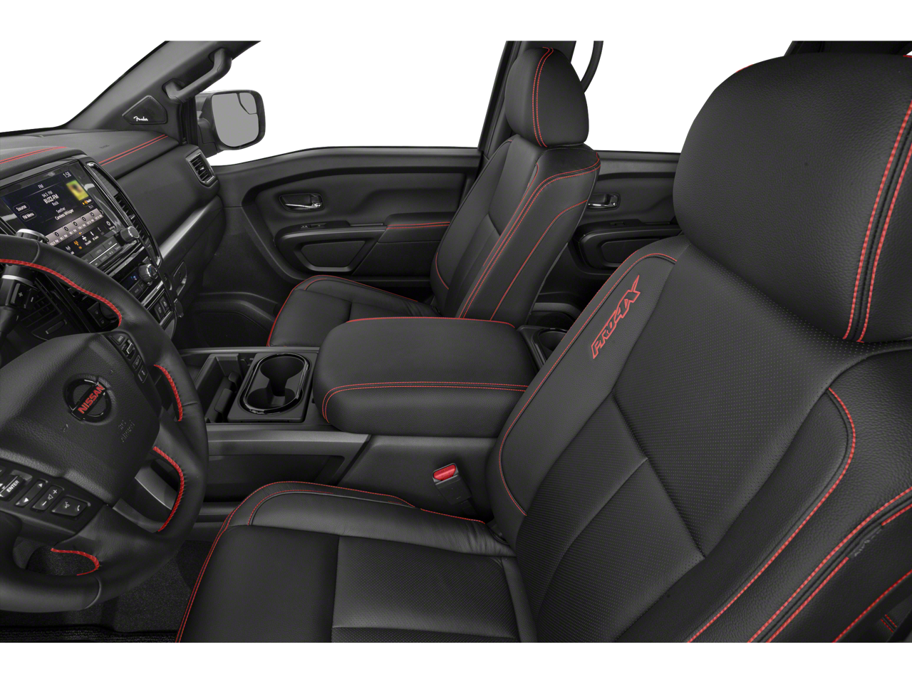 Inside, the Titan PRO-4X offers a premium driving experience. The Fender Premium Audio System with 12 speakers delivers a concert-quality sound, while the power driver's seat and leather-wrapped steering wheel ensure a comfortable and commanding ride. The Proximity Activation and Power Sliding Rear Window add to the truck's modern conveniences.