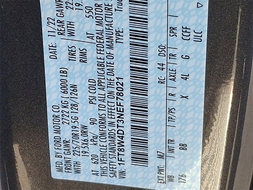 This Vehicle Includes the Following Options: FX4 Off-Road Package, GVWR: 14,000 lb Payload Package, Order Code 773A, 4WD, 10 Speakers, 19.5 Forged Polished Aluminum Wheels, 397 Amp Alternator, 4-Wheel Disc Brakes, ABS brakes, Adaptive Steering, Adjustable pedals, Air Conditioning, Alloy wheels, AM/FM radio: SiriusXM with 360L, Auto High-beam Headlights, Auto tilt-away steering wheel, Auto-dimming Rear-View mirror, Automatic temperature control, Brake assist, Bumpers: body-color, Compass, Customer-Placed Trailer Camera (Pre-Installed), Delay-off headlights, Driver door bin, Driver vanity mirror, Dual front impact airbags, Dual front side impact airbags, Dual rear wheels, Electronic Stability Control, Emergency communication system: SYNC 4 911 Assist, Exterior Parking Camera Rear, Flow-Through Console, Front anti-roll bar, Front Bucket Seats, Front Center Armrest, Front dual zone A/C, Front fog lights, Front reading lights, Fully automatic headlights, Garage door transmitter, Heated door mirrors, Heated front seats, Heated rear seats, Heated steering wheel, Illuminated entry, Leather steering wheel, Limited Slip w/4.30 Axle Ratio, Memory seat, Navigation system: Connected Navigation, Outside temperature display, Overhead airbag, Overhead console, Panic alarm, Passenger door bin, Passenger vanity mirror, Pedal memory, Power door mirrors, Power driver seat, Power passenger seat, Power steering, Power windows, Radio data system, Radio: B&O Sound System by Bang & Olufsen, Rain sensing wipers, Rapid-Heat Supplemental Cab Heater, Rear anti-roll bar, Rear Parking Sensors, Rear reading lights, Rear seat center armrest, Rear step bumper, Rear window defroster, Remote ke
