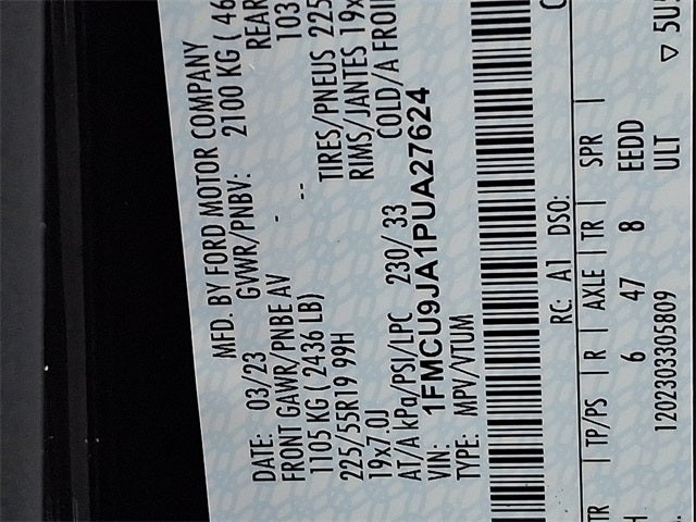 THIS VEHICLE INCLUDES THE FOLLOWING FEATURES AND OPTIONS: AWD, 2.91 Axle Ratio, 4-Wheel Disc Brakes, 6 Speakers, ABS brakes, Air Conditioning, Alloy wheels, AM/FM radio: SiriusXM, AM/FM Stereo, Auto High-beam Headlights, Auto-dimming Rear-View mirror, Automatic temperature control, Brake assist, Bumpers: body-color, Compass, Delay-off headlights, Driver door bin, Driver vanity mirror, Dual front impact airbags, Dual front side impact airbags, Electronic Fuel Door Release, Electronic Stability Control, Emergency communication system: SYNC 4 911 Assist, Exterior Parking Camera Rear, FordPass Connect, Four wheel independent suspension, Front anti-roll bar, Front Bucket Seats, Front Center Armrest, Front dual zone A/C, Front fog lights, Front reading lights, Fully automatic headlights, Garage door transmitter, Heated ActiveX Trimmed Front Sport Contour Bucket Seats, Heated door mirrors, Heated front seats, Heated steering wheel, Illuminated entry, Knee airbag, Low tire pressure warning, Memory seat, Navigation system: Connected Navigation, Neutral Towing Capability, Occupant sensing airbag, Outside temperature display, Overhead airbag, Overhead console, Panic alarm, Passenger door bin, Passenger vanity mirror, Pedestrian Alert Sounder, Power door mirrors, Power driver seat, Power Liftgate, Power passenger seat, Power steering, Power windows, Radio data system, Rain sensing wipers, Rear anti-roll bar, Rear reading lights, Rear seat center armrest, Rear window defroster, Rear window wiper, Remote keyless entry, Security system, Speed control, Speed-sensing steering, Speed-Sensitive Wipers, Split folding rear seat, Spoiler, Steering wheel mounted audio controls, SYNC 4 w/Enhanced Voice Recognition, Telescoping steering wheel, Tilt steering wheel, Traction control, Trip computer, Variably intermittent wipers, and Wheels: 19 Machined-Face Aluminum.