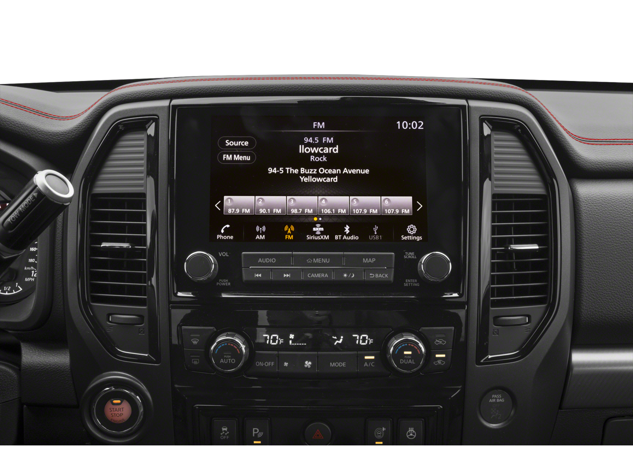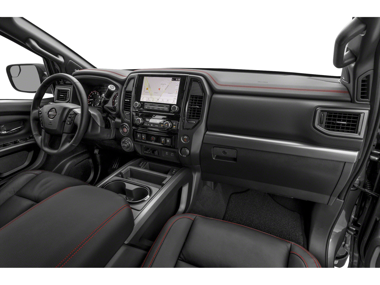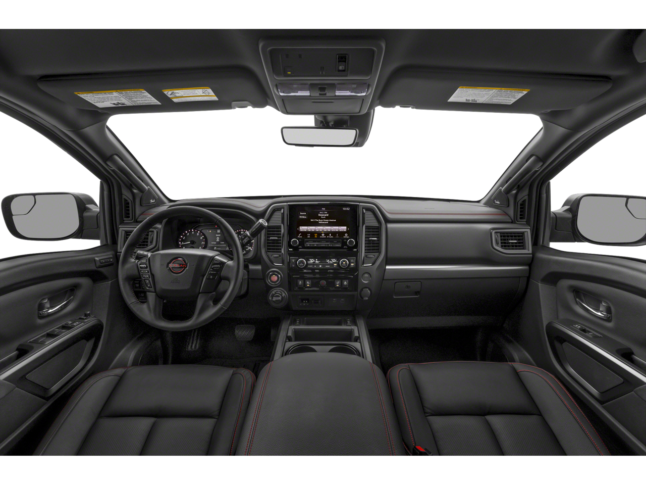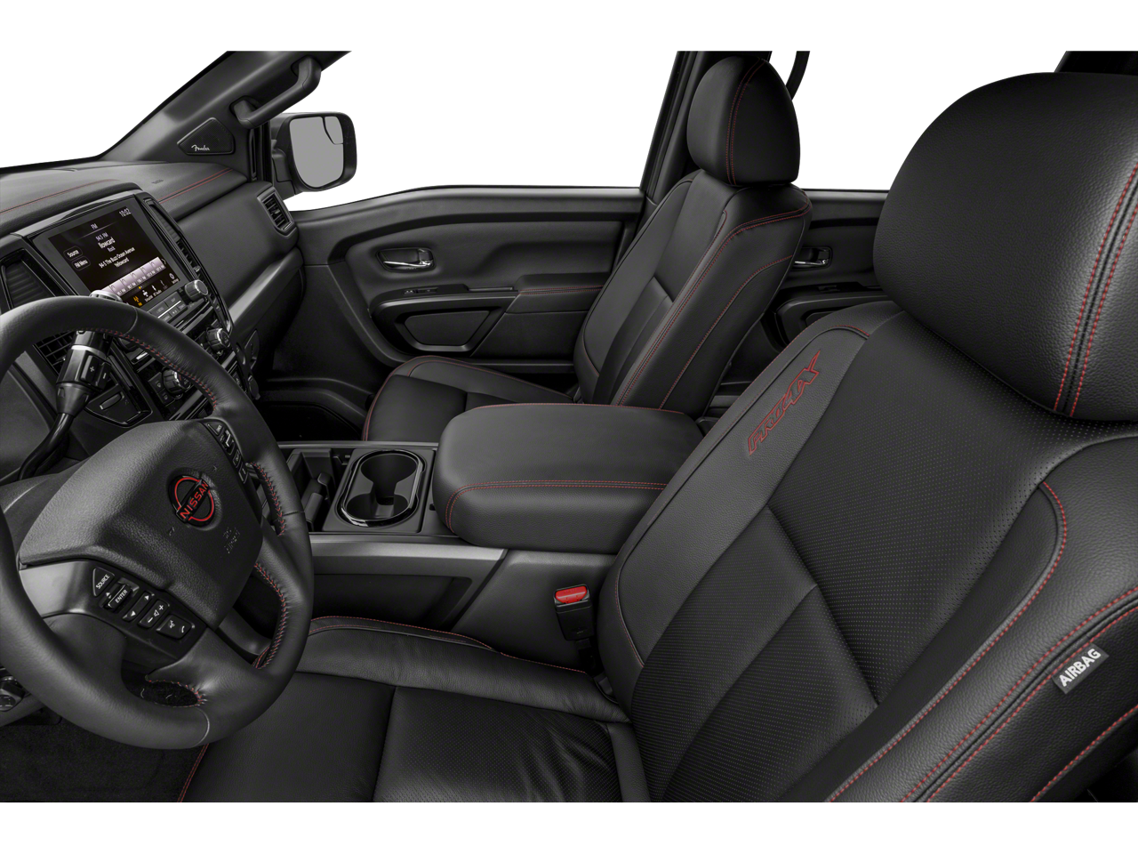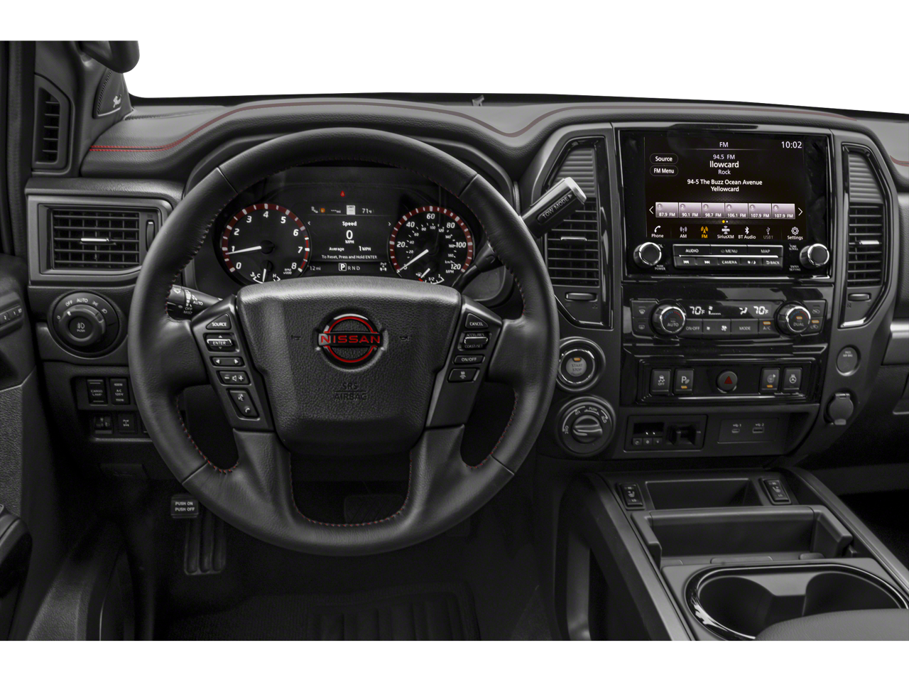 The interior of the Titan PRO-4X is a true sanctuary of comfort and convenience. Heated and ventilated front seats, a heated steering wheel, and a dual-panel panoramic moonroof create an unparalleled driving experience. The Fender Premium Audio System with 12 speakers will immerse you in crystal-clear sound, while the Intelligent Around View Monitor provides a 360-degree perspective to simplify parking and maneuvering.