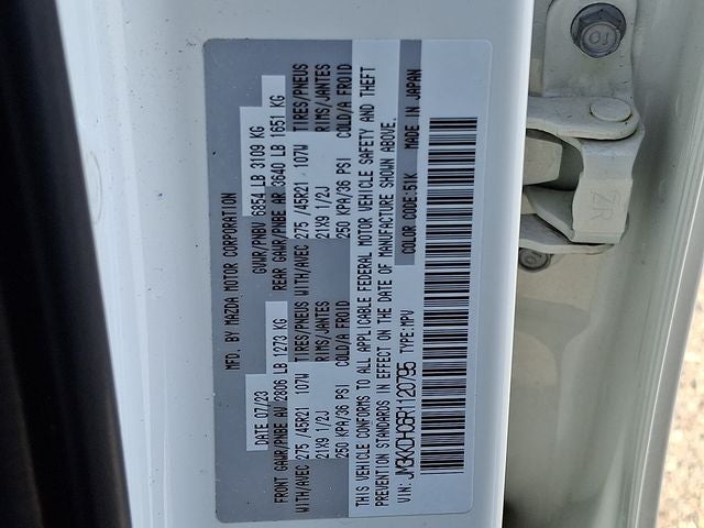 This Vehicle Includes the Following Options: 12 Speakers, 3.692 Axle Ratio, 3rd row seats: bench, 4-Wheel Disc Brakes, ABS brakes, Air Conditioning, Alloy wheels, AM/FM radio: SiriusXM, Auto High-beam Headlights, Auto-dimming door mirrors, Auto-dimming Rear-View mirror, Automatic temperature control, Brake assist, Bumpers: body-color, Compass, Delay-off headlights, Driver door bin, Driver vanity mirror, Dual front impact airbags, Dual front side impact airbags, E911 Automatic Emergency Notification, Electronic Stability Control, Emergency communication system: MAZDA CONNECT, Four wheel independent suspension, Front anti-roll bar, Front Bucket Seats, Front Center Armrest w/Storage, Front dual zone A/C, Front reading lights, Fully automatic headlights, Garage door transmitter: HomeLink, Heads-Up Display, Heated door mirrors, Heated Front Bucket Seats, Heated front seats, Heated steering wheel, Illuminated entry, Infotainment System Voice Command, Knee airbag, Leather Shift Knob, Leather steering wheel, Low tire pressure warning, Mazda Connected Services, Mazda Navigation System, Memory seat, Nappa Leather Seat Trim, Navigation system: MAZDA CONNECT, Occupant sensing airbag, Outside temperature display, Overhead airbag, Overhead console, Pandora Internet Radio Integration, Panic alarm, Passenger door bin, Passenger vanity mirror, Power door mirrors, Power driver seat, Power Liftgate, Power moonroof, Power passenger seat, Power steering, Power windows, Radio Broadcast Data System Program Information, Radio data system, Radio: AM/FM w/Bose Audio Sound System, Rain sensing wipers, Rear air conditioning, Rear anti-roll bar, Rear reading lights, Rear window defroster, Rear window wiper, Remote keyless entry, Rhodium White Premium Paint Charge, Security system, SMS Text Msg Audio Delivery & Reply, Speed control, Speed-sensing steering, Split folding rear seat, Spoiler, Steering wheel memory, Steering wheel mounted audio controls, Tachometer, Telescoping steering wheel, Tilt steering wheel, Traction control, Trip computer, Turn signal indicator mirrors, Variably intermittent wipers, and Wheels: 21 x 9.5J Aluminum Alloy.